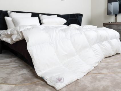 Немецкий хлопковый сатин высочайшей плотности соткан из тончайших нитей (Premium Satin – Nе 200/200 485 ТС) и прошел финишную обработку SanProCare® Sensitive, обеспечивающую усиленную гигроскопичность и придающую ей «пуховую мягкость». Особо тонкий, мягкий и «нешуршащий» чехол обладает повышенной износостойкостью и предотвращает проникновение пылевых клещей внутрь изделий. Наполнителем служит пух высочайшего качества, отобранный на гусиных фермах Сибири, которая, по утверждению биологов, является зоной проживания гусей, носящих пух максимально больших размеров, что, безусловно, влияет на пуховую массу положительно и наполнитель имеет повышенный коэффициент упругости (Fill Power), достигающий значений в 850 ед.