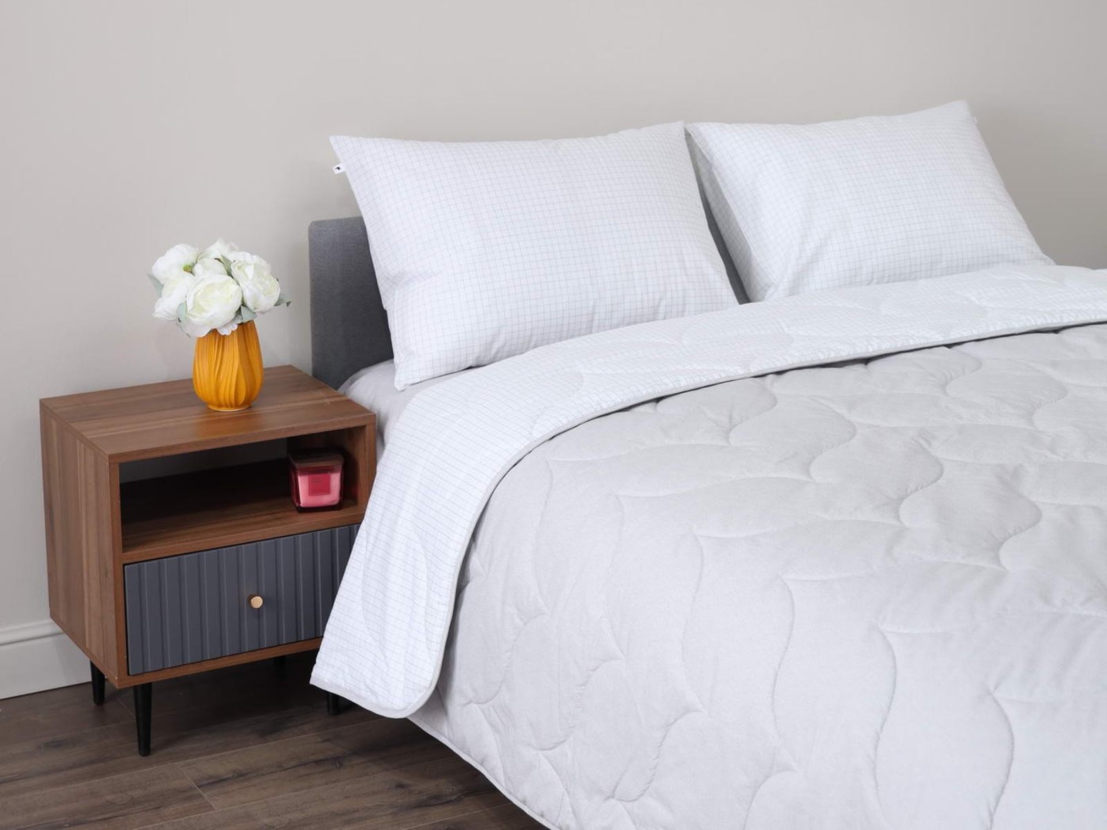 Комплект Мелвин легко стирается в обычной машине в бережном режиме и также легко гладится.