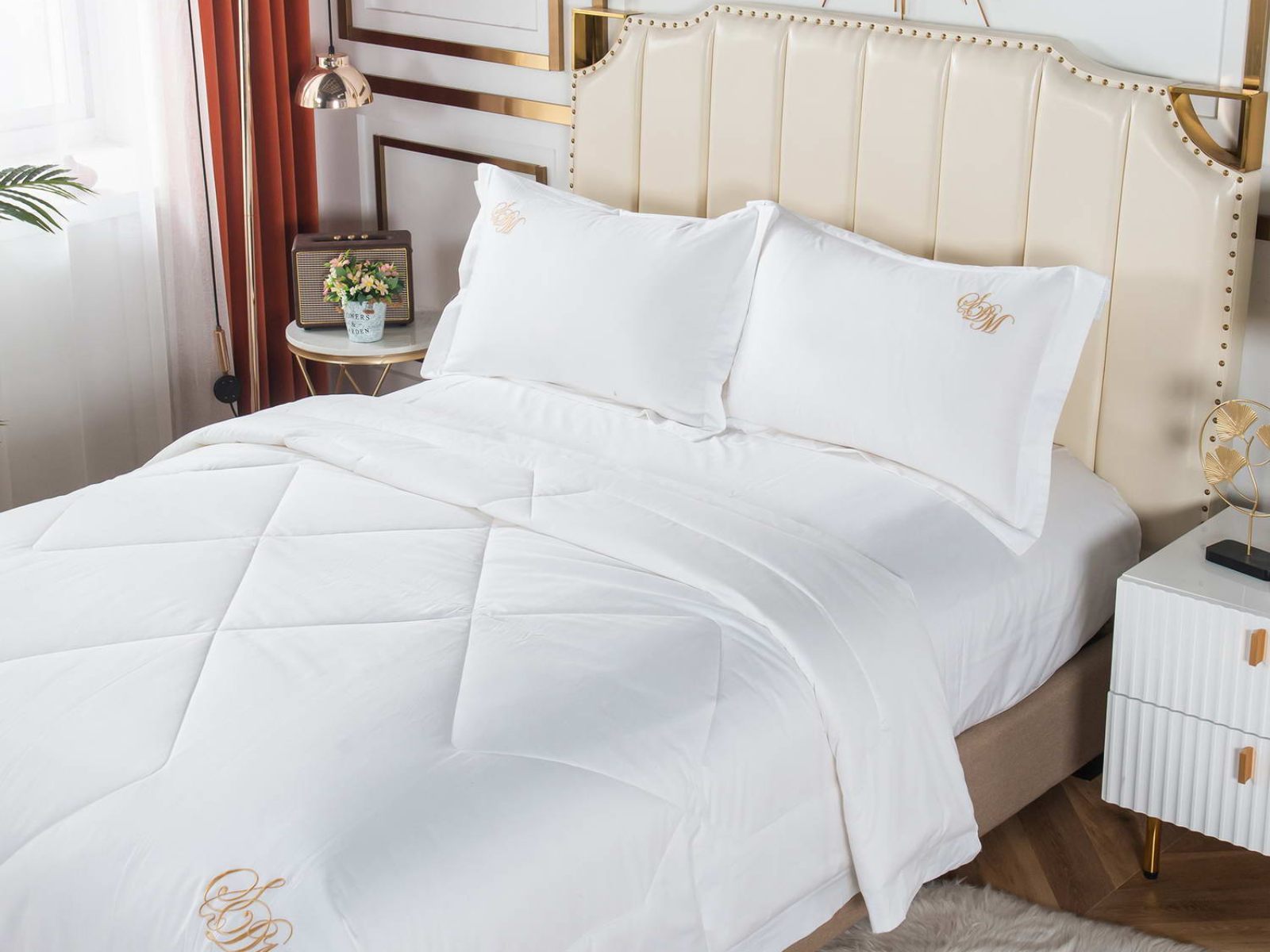 Элегантные комплекты постельного белья с одеялом премиум класса из нежной, натуральной ткани макосатин Нельсон. Этот материал обладает рядом важных качеств: он прочный, но мягкий, гладкая поверхность придает постельному белью красивый внешний вид. Натуральная ткань не вызывает аллергии и раздражения, такое постельное белье приятно использовать в любое время года, и в жару, и в холод.