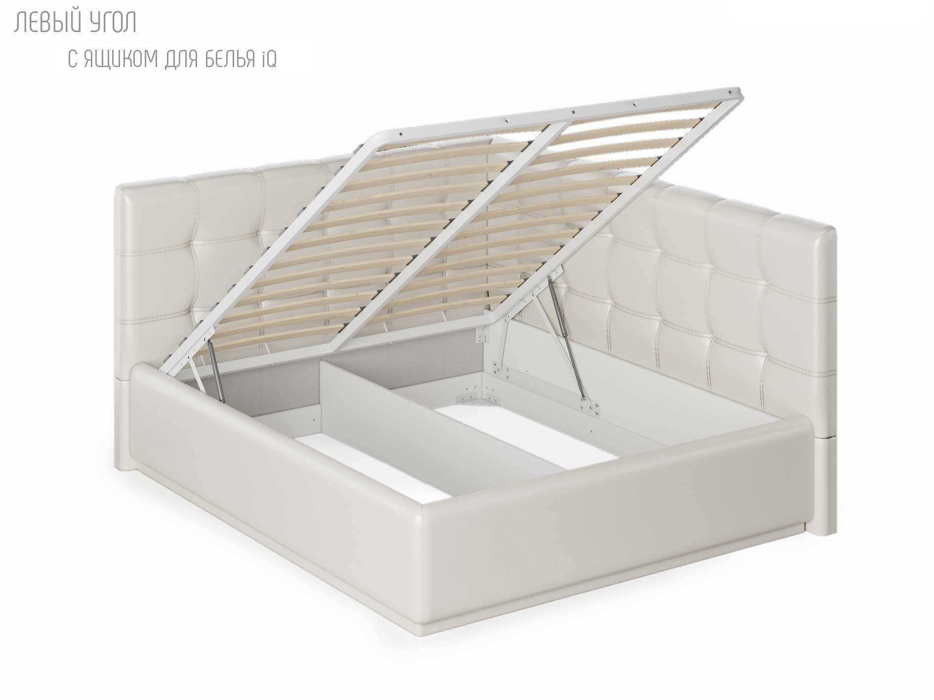 Кровать укомплектована IQ с подъемным механизмом и ящиком для белья без дна (дополнительная платная опция - дно к ящику IQ из HDF (ХДФ). Каркас кровати на цоколе, декоративный чехол на цоколе съёмный. Глубина ящика для белья - 30 см, без ограничения нагрузки на ящик.