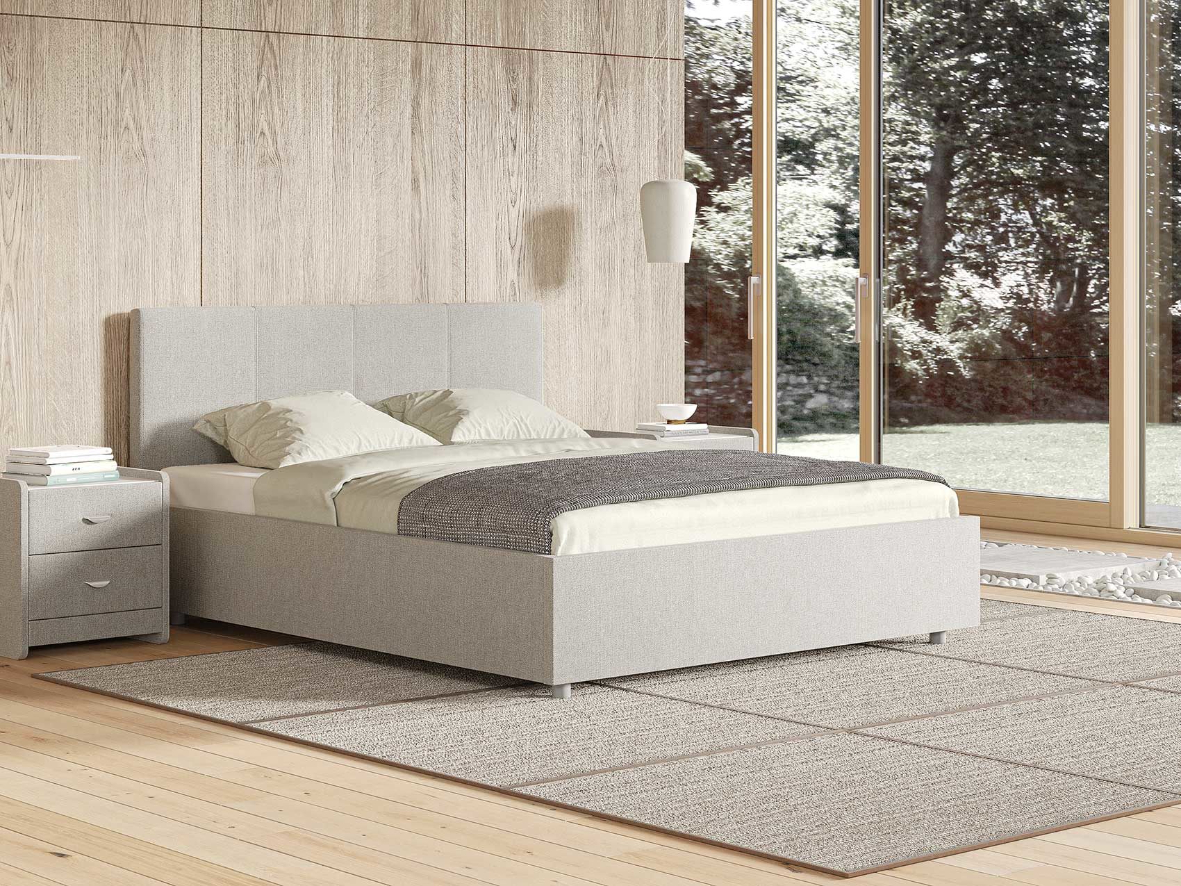 Элегантная кровать с изголовьем украшенным декоративной вертикальной строчкой. Модель изготовлена из ДСП.