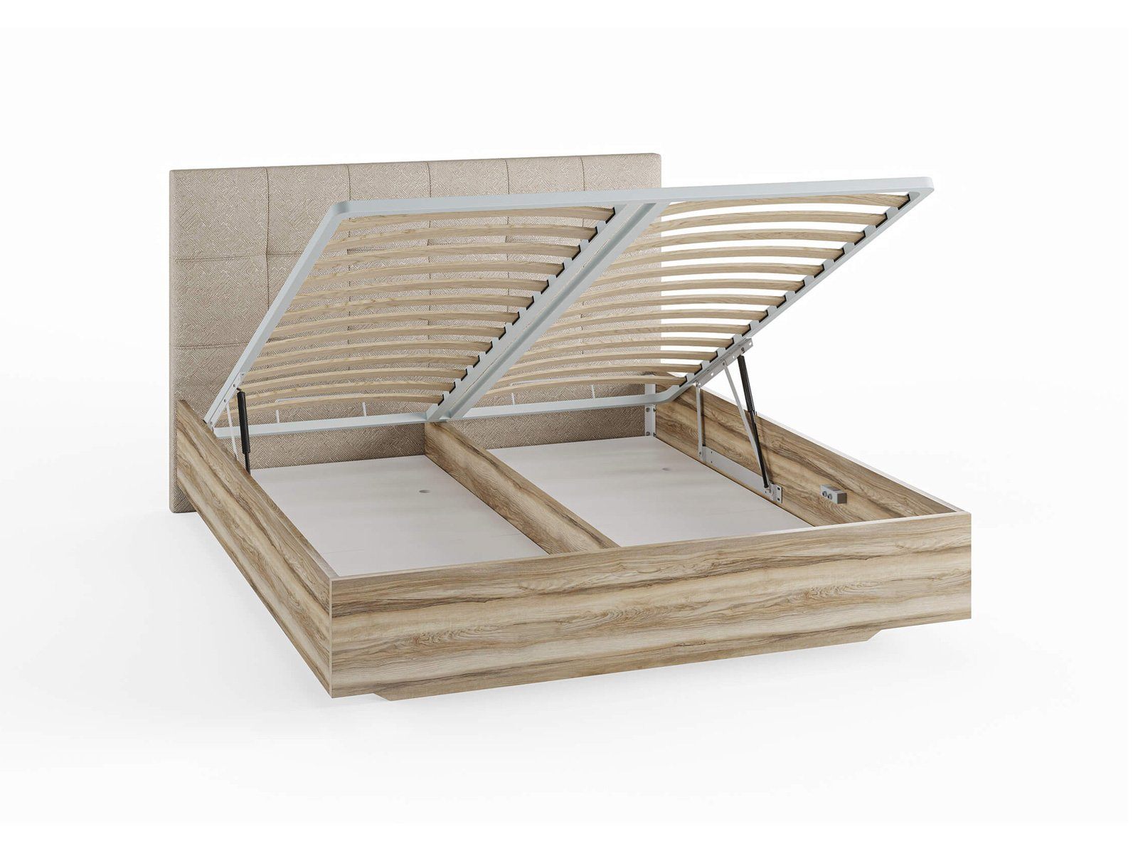 Кровать комплектуется металлическим основанием и подъемным механизмом со вместительным бельевым ящиком. Дно бельевого ящика легко сдвигается для обеспечения уборки под кроватью.