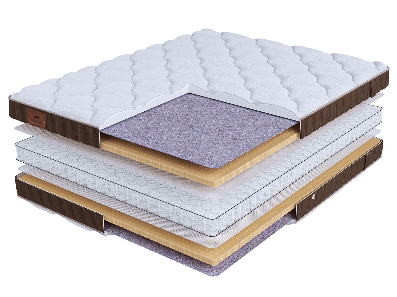 Хлопковая трикотажная ткань чехла обеспечивает комфорт и обладает отличной воздухопроницаемостью. Высокообъемная стежка с использованием холлофайбера (600гр.) подарит дополнительный комфорт спальному месту. Изысканный бурлет из мягкого велюра красивого бежевого цвета придает матрасу роскошный внешний вид и подчеркивает его премиальный статус. Каждая модель серии LIFE украшена фирменной кожаной биркой BeautySon, подтверждающая исключительность каждого матраса.