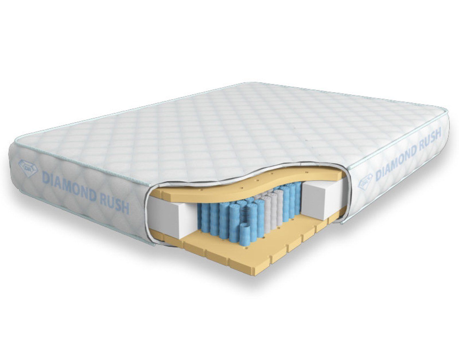 Матрас из серии Luxury Diamond имеет в своей основе независимый пружинный блок MultiZone, состоящий из пружин диаметром 3-4 см разной жесткости. В качестве настилочных слоев поверх пружинного блока используются листы перфорированного натурального латекса. Это один из самых мягких материалов, он позволяет помаксимуму ощутить на себе ортопедический эффект от пружинного блока.