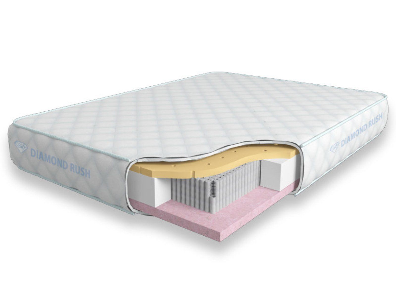 Матрас из серии Luxury Diamond имеет в своей основе независимый пружинный блок 3000, состоящий из пружин диаметром 2-3 см. В качестве настилочных слоев поверх пружинного блока используются листы натурального латекса с перфорацией и вязкоэластичного Меморикса, обладающего эффектом памяти. Обе стороны матраса являются мягкими.