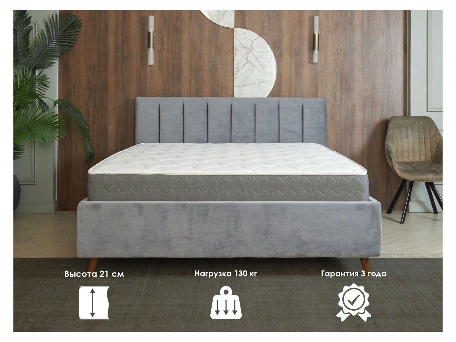 Матрас сочетает разное наполнение по сторонам, сохраняя единый уровень жёсткости, и использует зонированный пружинный блок для точечного распределения нагрузки.