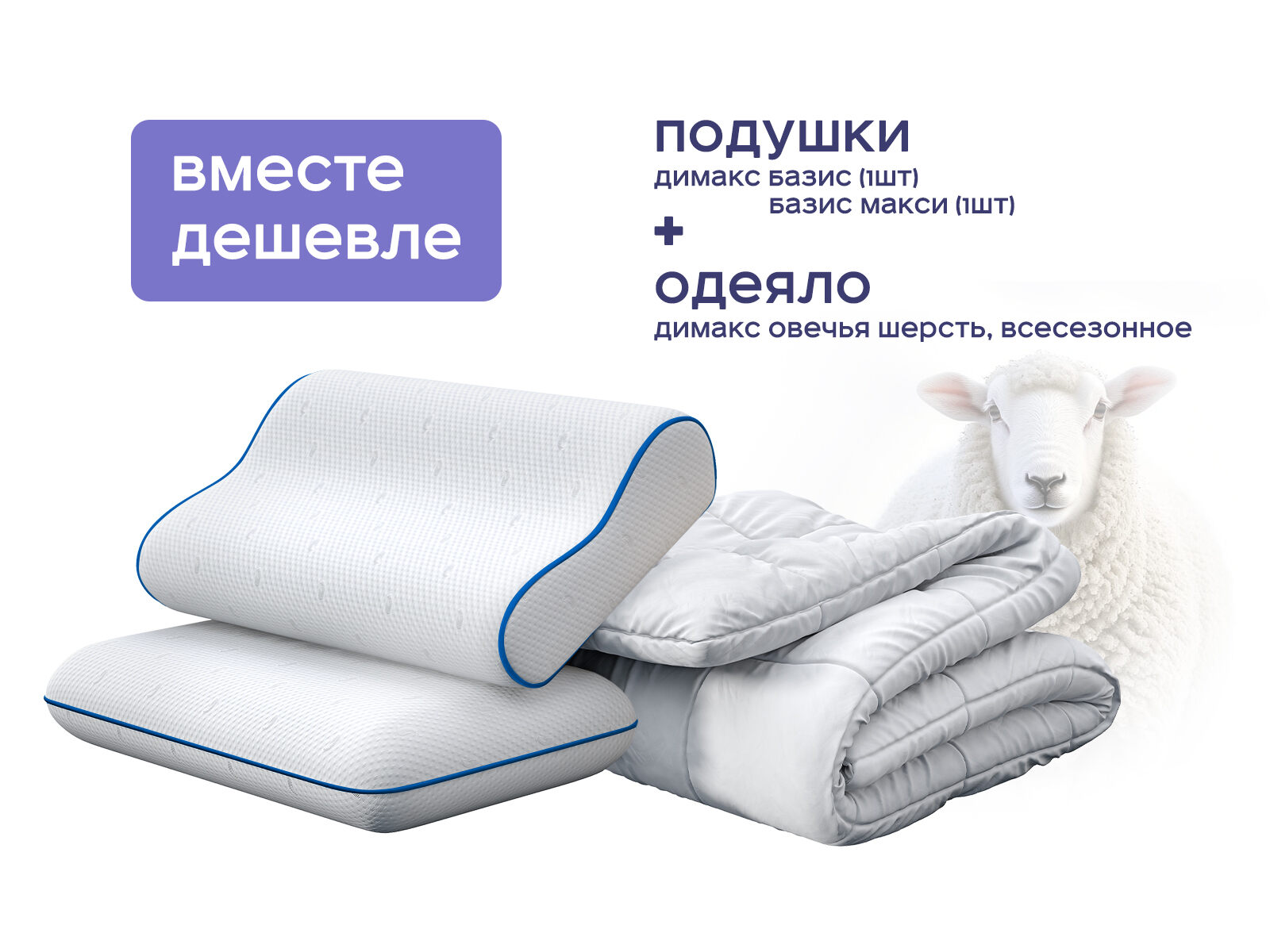Комплект одеяло Димакс Овечья шерсть всесезонное + подушка Димакс Базис 1 шт. + подушка Димакс Базис Макси 1 шт. — это не набор, а технология. Шерсть дарит природное тепло, подушки — точную поддержку. Вы получаете три продукта, которые работают как единая система: одеяло регулирует на температуру, подушки — поддерживают голову и позвоночник. А экономия до 46% — ваш бонус за умное решение. Ваш идеальный сон — это не мечта, это выбор.