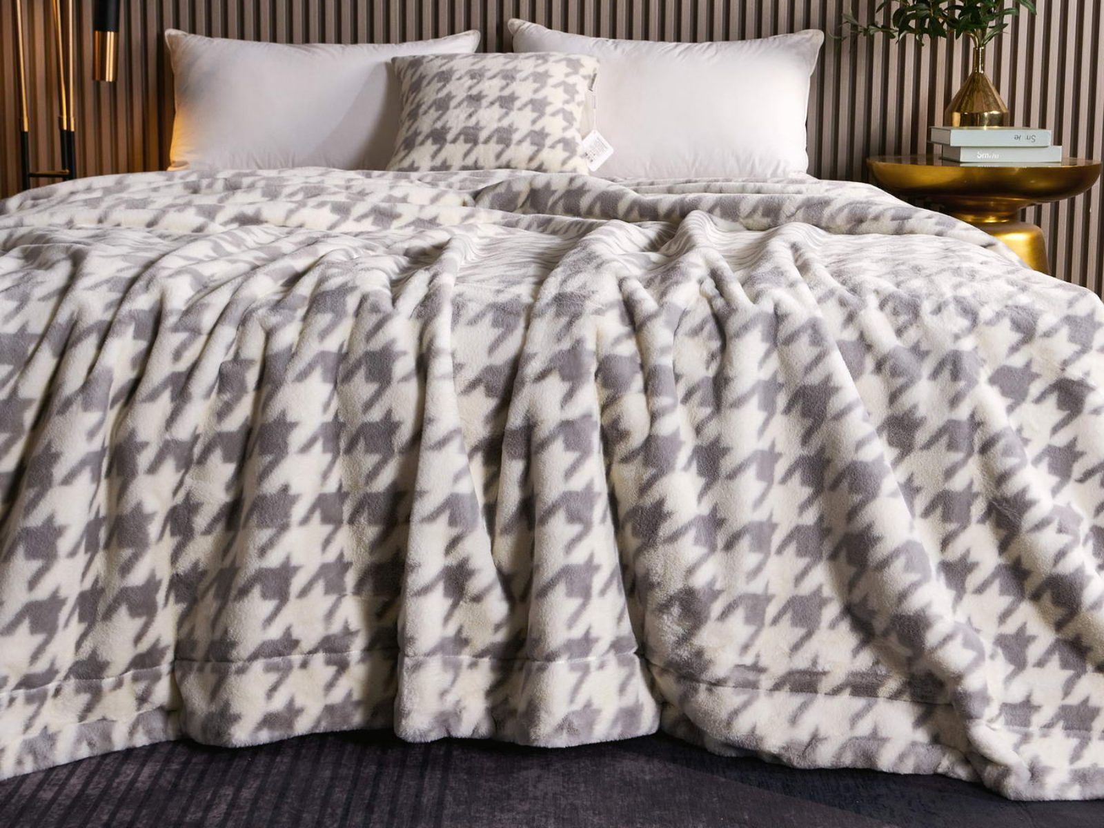 Sofi De Marko представляет вашему вниманию коллекцию Эрнесто, включающую в себя пледы и декоративные наволочки из искусственного меха с принтом «гусиная лапка».