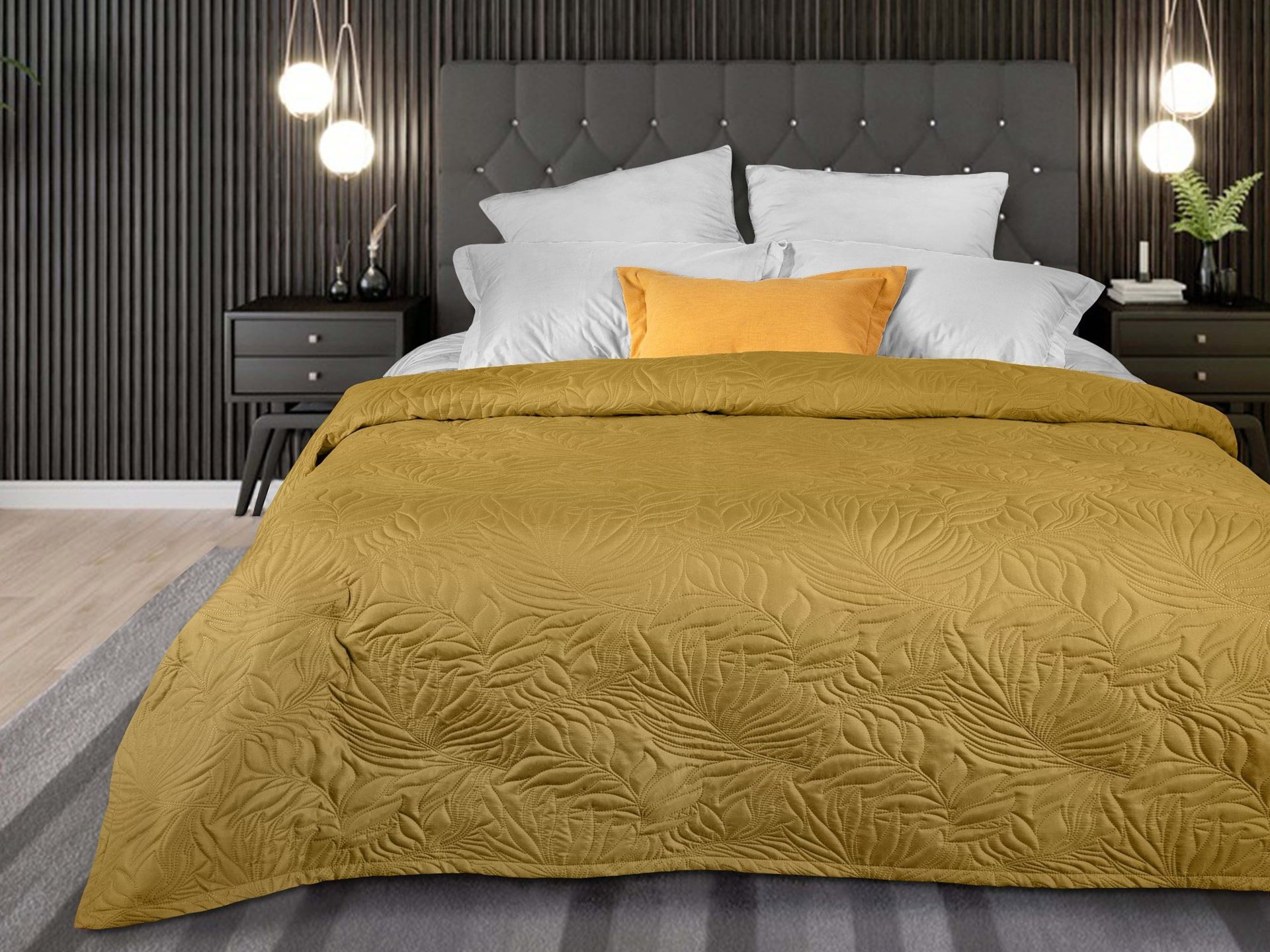 Покрывало Arti с оригинальной стежкой Листья в ультрамодном золотом цвете будет органично смотреться в любом интерьере. Изделие выполнено из современной ткани Биософт™ с бархатистой фактурой. Ткань не только приятная на ощупь, но и очень практичная. Благодаря ей покрывало обладает хорошей гигроскопичностью, хорошо сохраняет форму и быстро сохнет. Изделие изготовлено по уникальной технологии безниточной стежки Ультрастеп™, которая придает ему особую прочность и продлевает срок службы. Современный дизайн стежки в сочетании с благородными цветами идеально впишется в интерьер Вашей спальни.
