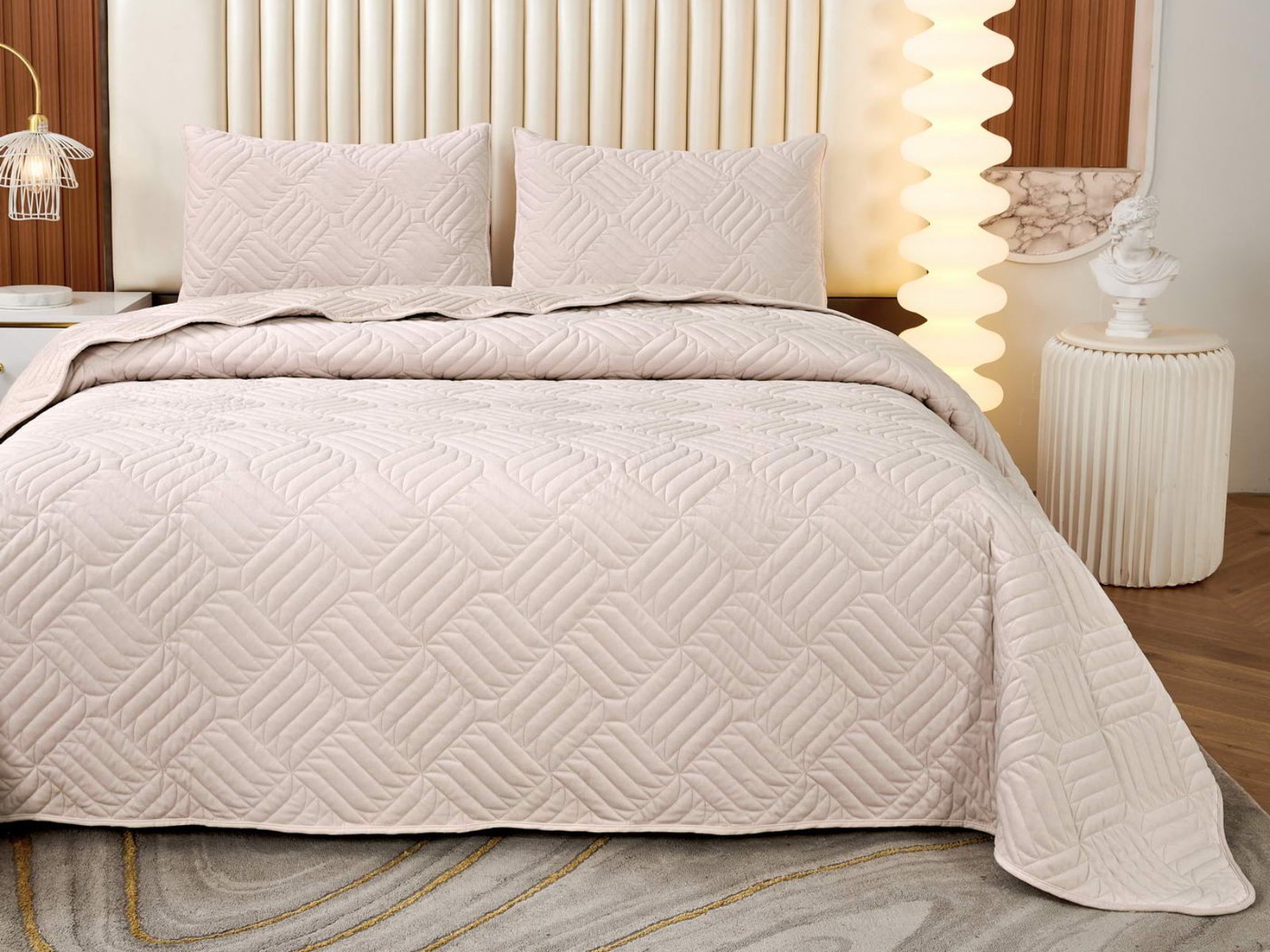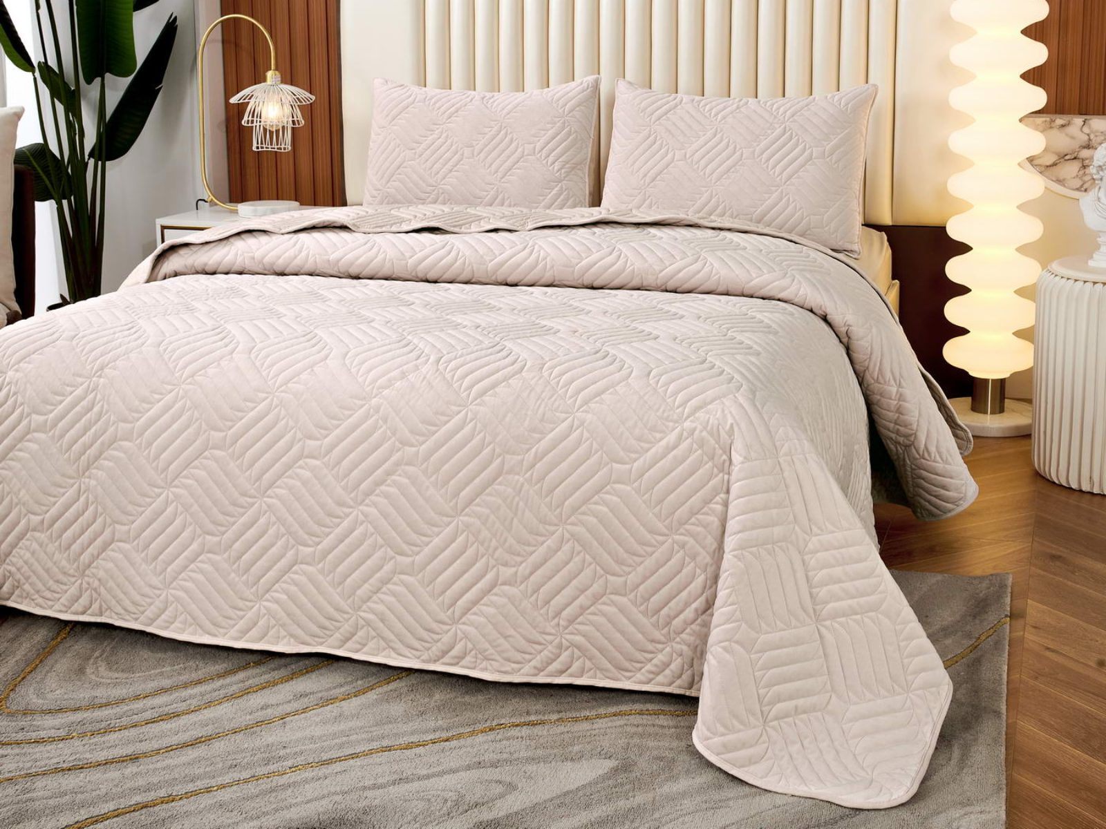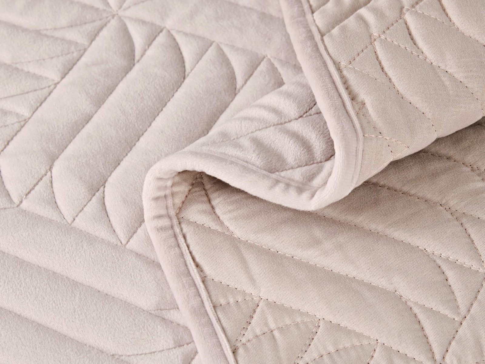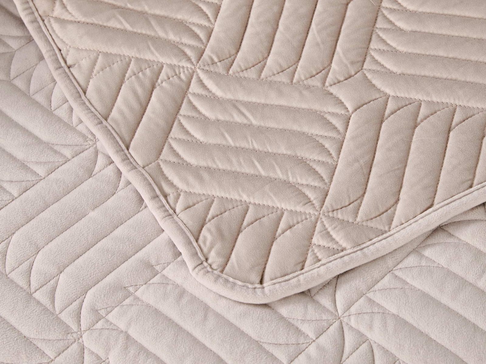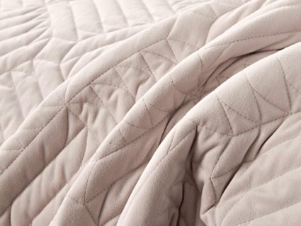 Покрывала выполнены в 10 оттенках: крем, мокко, пепельный, песочный, светло-бежевый, светло-серый, серый, темно-серый, чайная роза и черный. Стежка в виде геометрического орнамента подойдет к любому современному интерьеру. Из-за особого плетения, велюровая ткань покрывала отражает свет и красиво переливается при различном освещении.