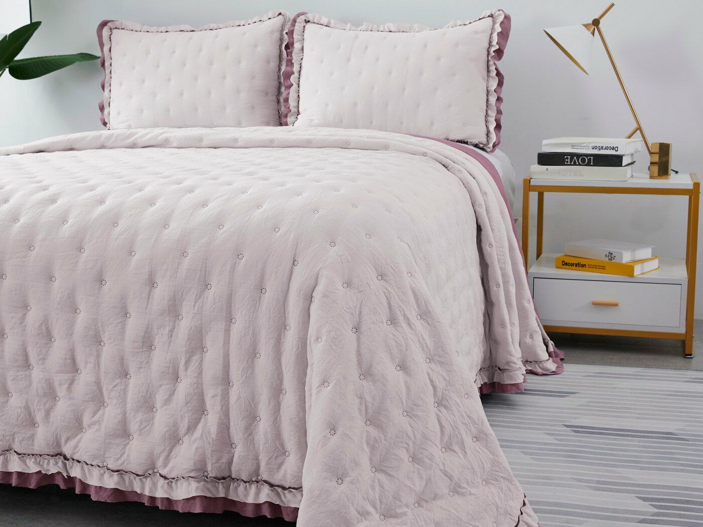 Покрывала выполнены в десяти оттенках, они подойдут для различных интерьеров, объединяет коллекцию потрясающее качество и приятный внешний вид. Изделия декорированы рюшами по краю, что подчеркивает из красоту и изысканность.