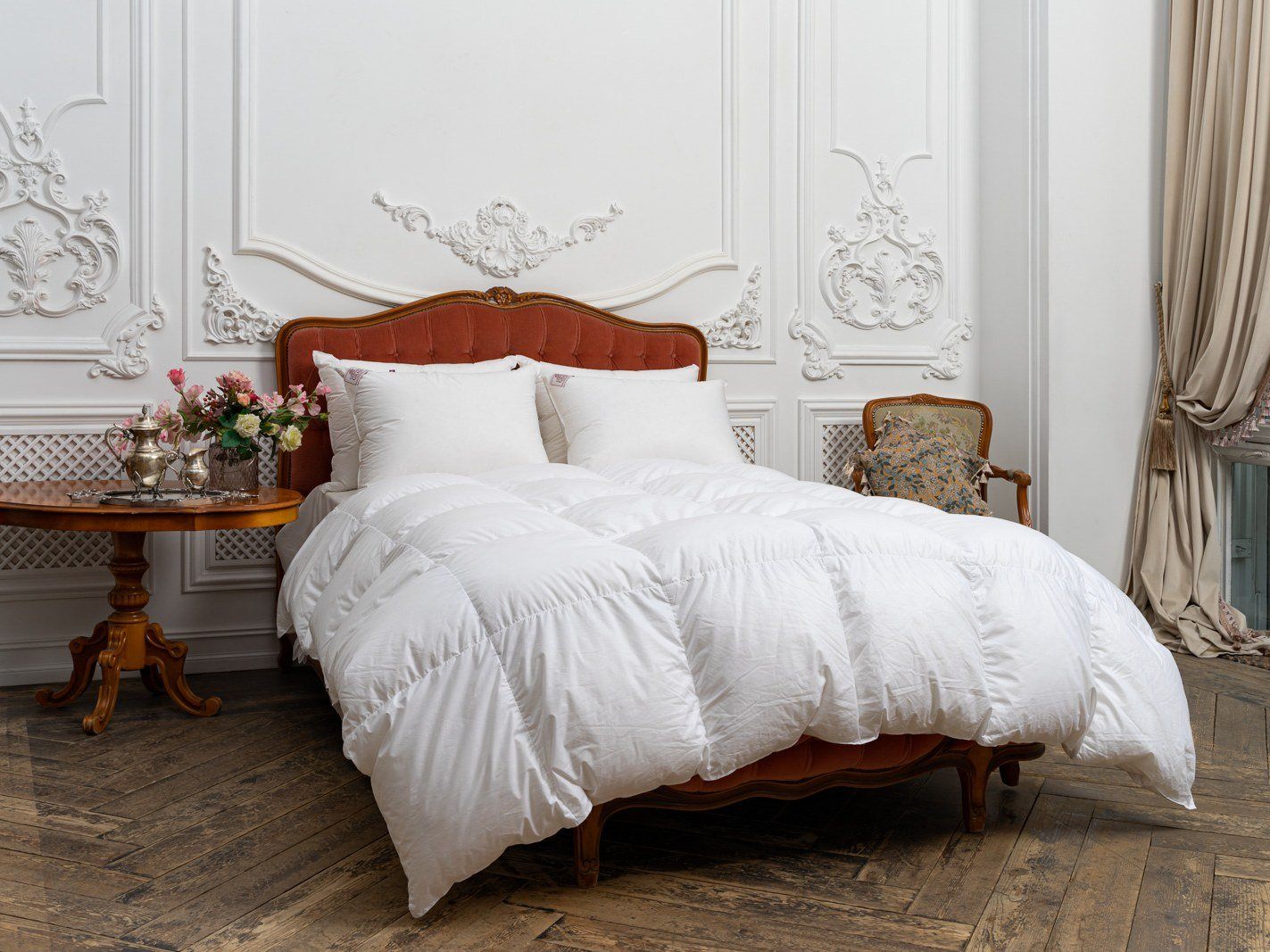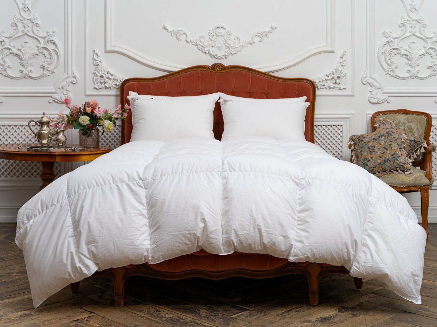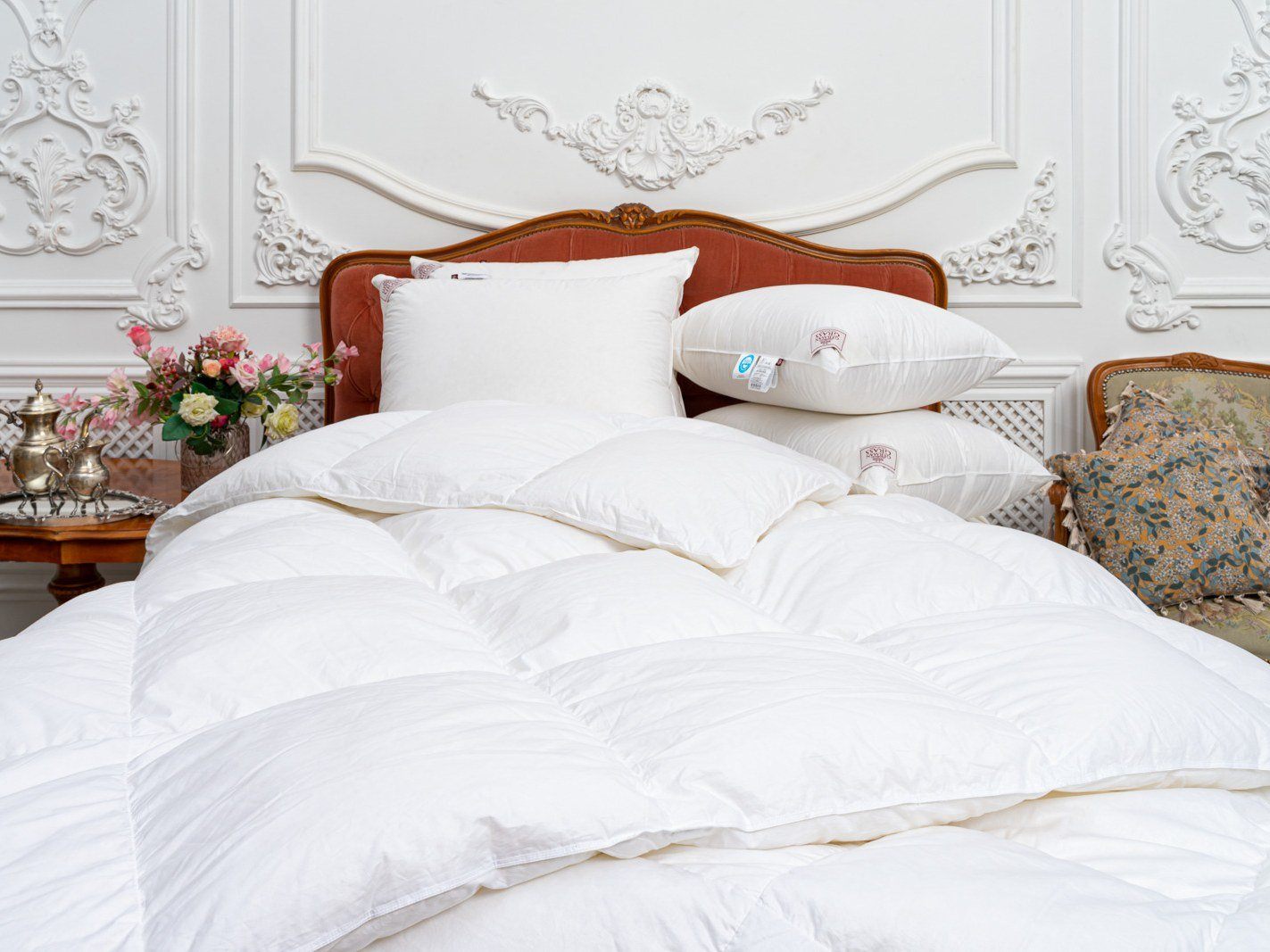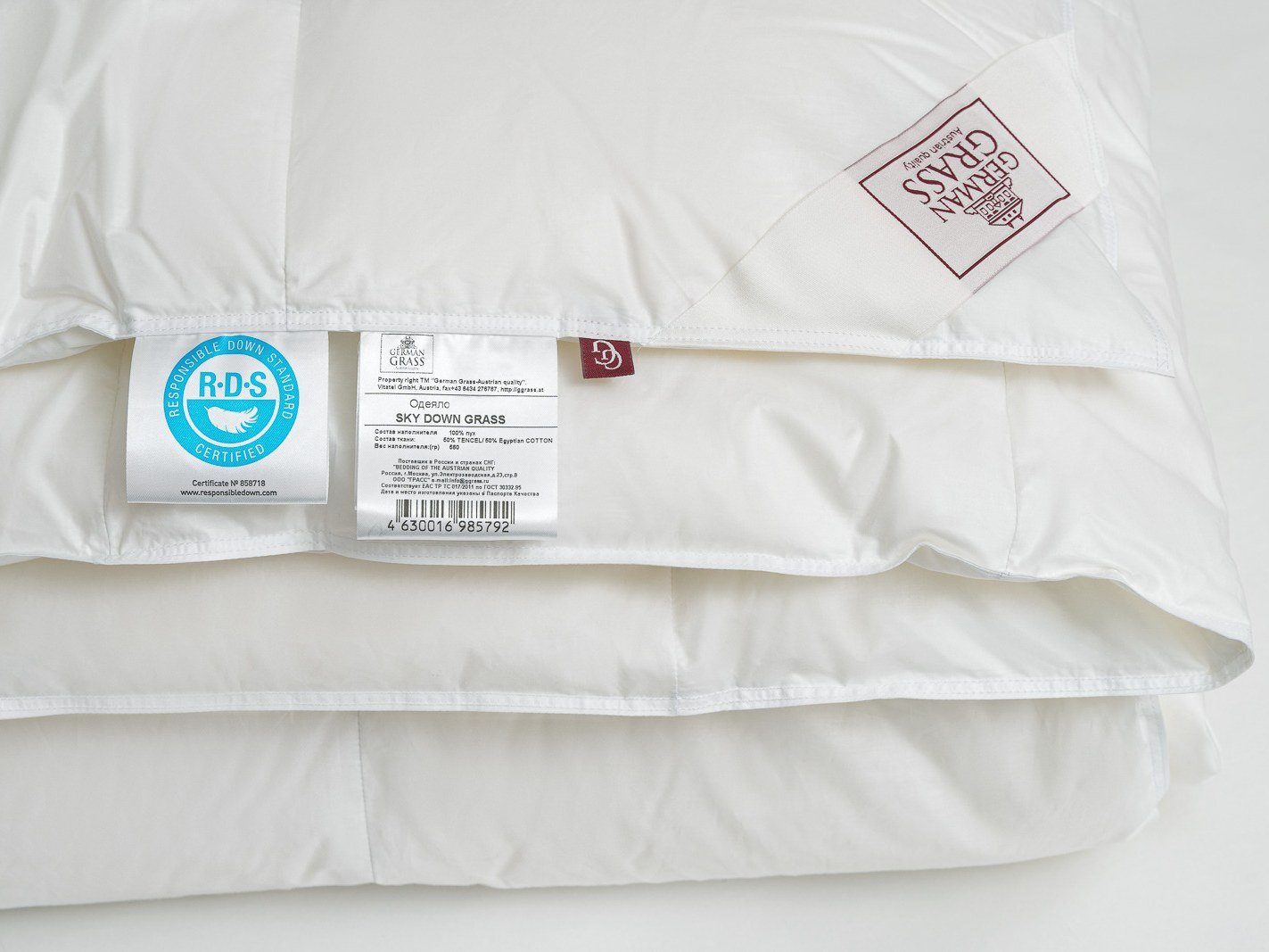 Наполнитель: 100% новый, гусиный белый пух высшего качества, отсортированный вручную, с коэффициентом упругости (Fill Power) не менее 800ед.